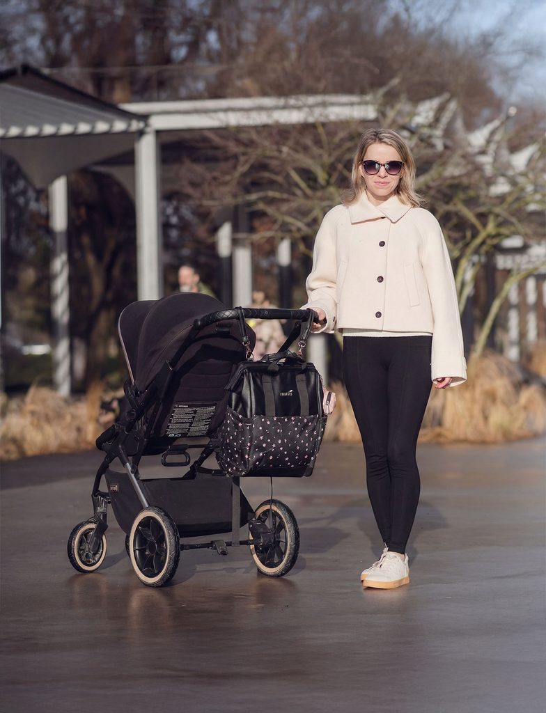 Praktický batoh v jemném květinovém designu, který udrží pořádek i v tom nejrušnějším dni. Díky několika kapsám máš jasno v tom, kam sáhnout pro lahvičku, svačinu nebo svoje drobnosti. Pevné poutko zvládne každodenní používání a odnímatelná kulatá kapsička je ideální na dudlík či jiné maličkosti, které potřebuješ mít hned po ruce. Odolný, přehledný a připravený doprovázet Tě při městských pochůzkách i na vycházkách s kočárkem.
