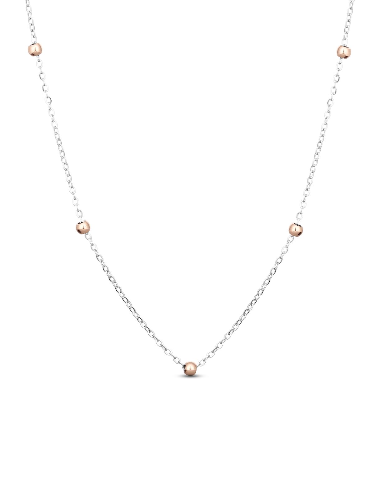 „Rozhodli jsme se vytvořit šperk, který bude vypadat skvěle s jakýmkoliv outfitem. Výsledkem je tento elegantní a zároveň hravý náhrdelník ve stříbrné barvě zdobený malými kuličkami v barvě rose gold.“