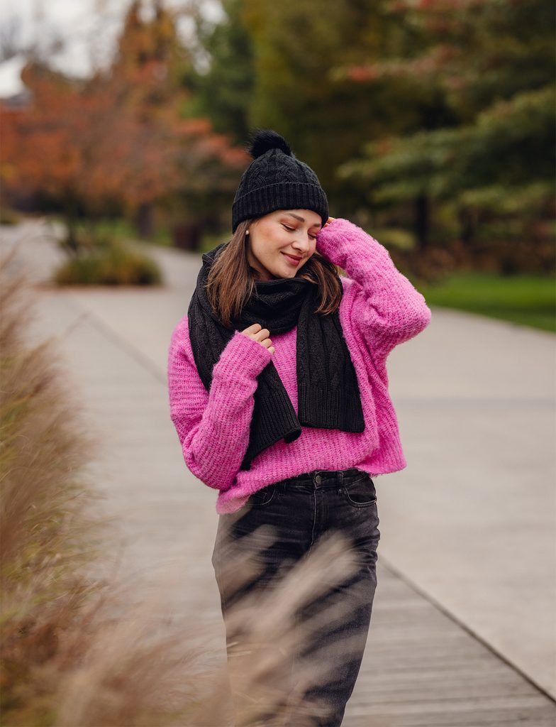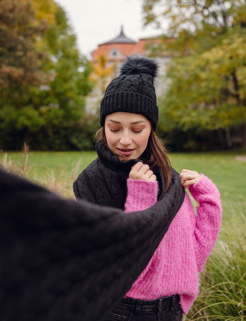 Sheron Set Black pletený set šály a čepice s copánkovým vzorem