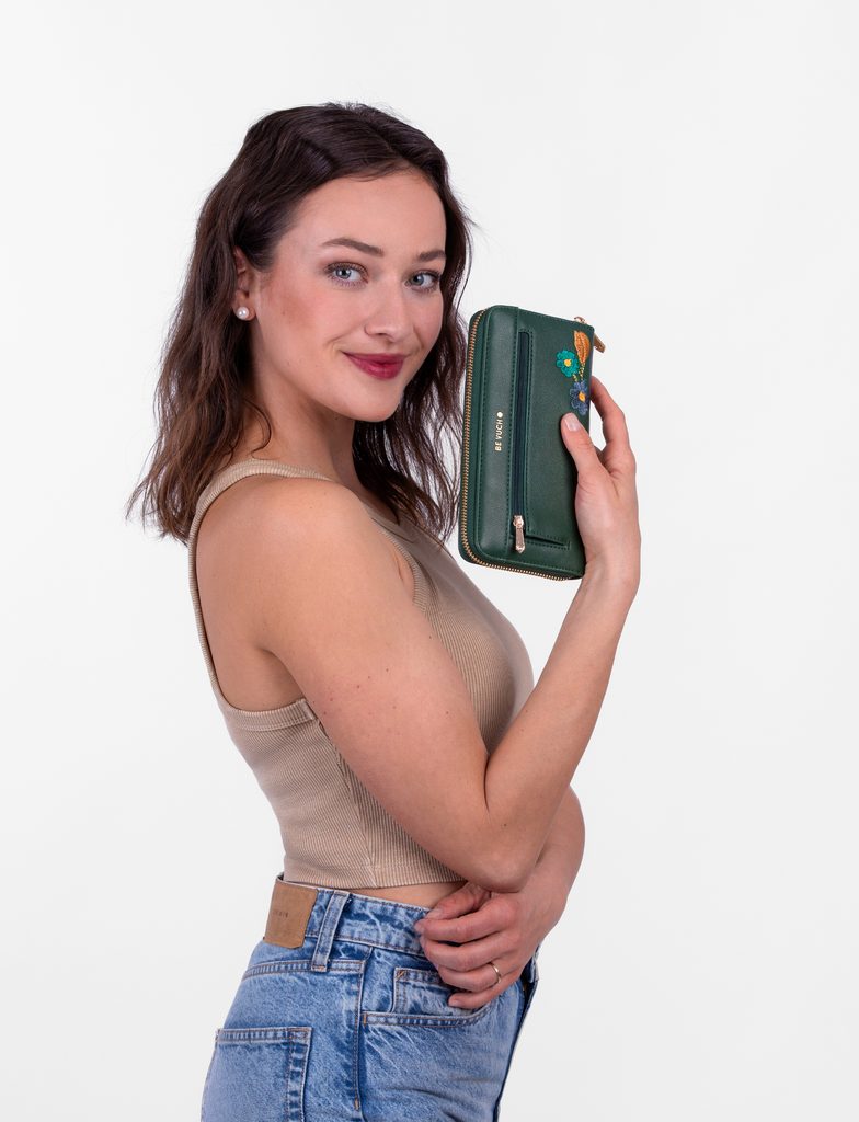 Nightie Nicci Flowers Green peněženka na zip s květinovou výšivkou